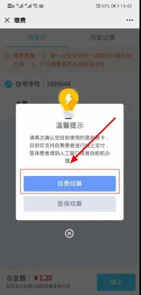 5.查看“温馨提示”信息,点击“自费结算”按钮尽心结算。