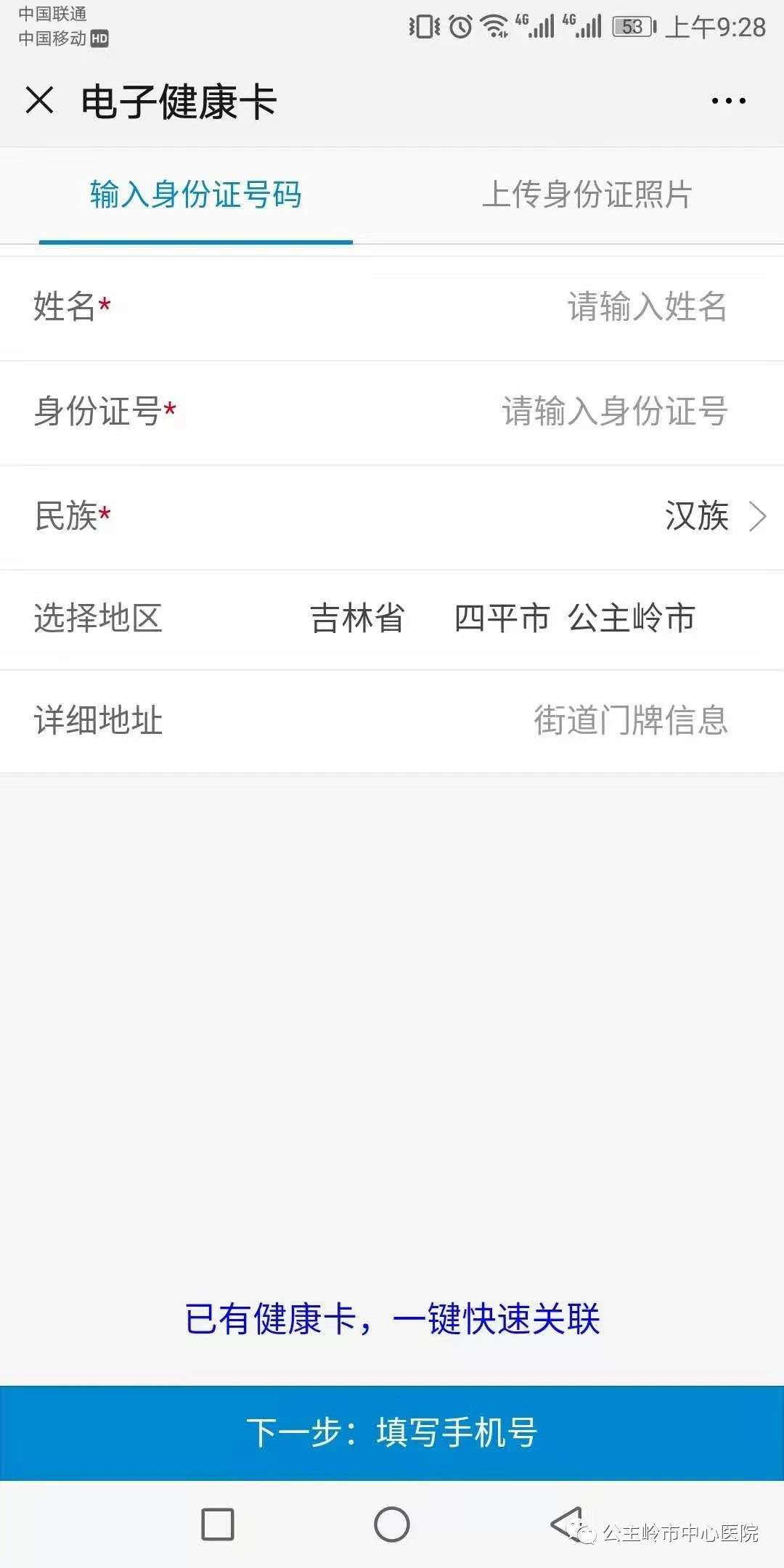 ① 如果没有注册过健康卡请选择输入身份证号码或者上传身份证照片进行添加。