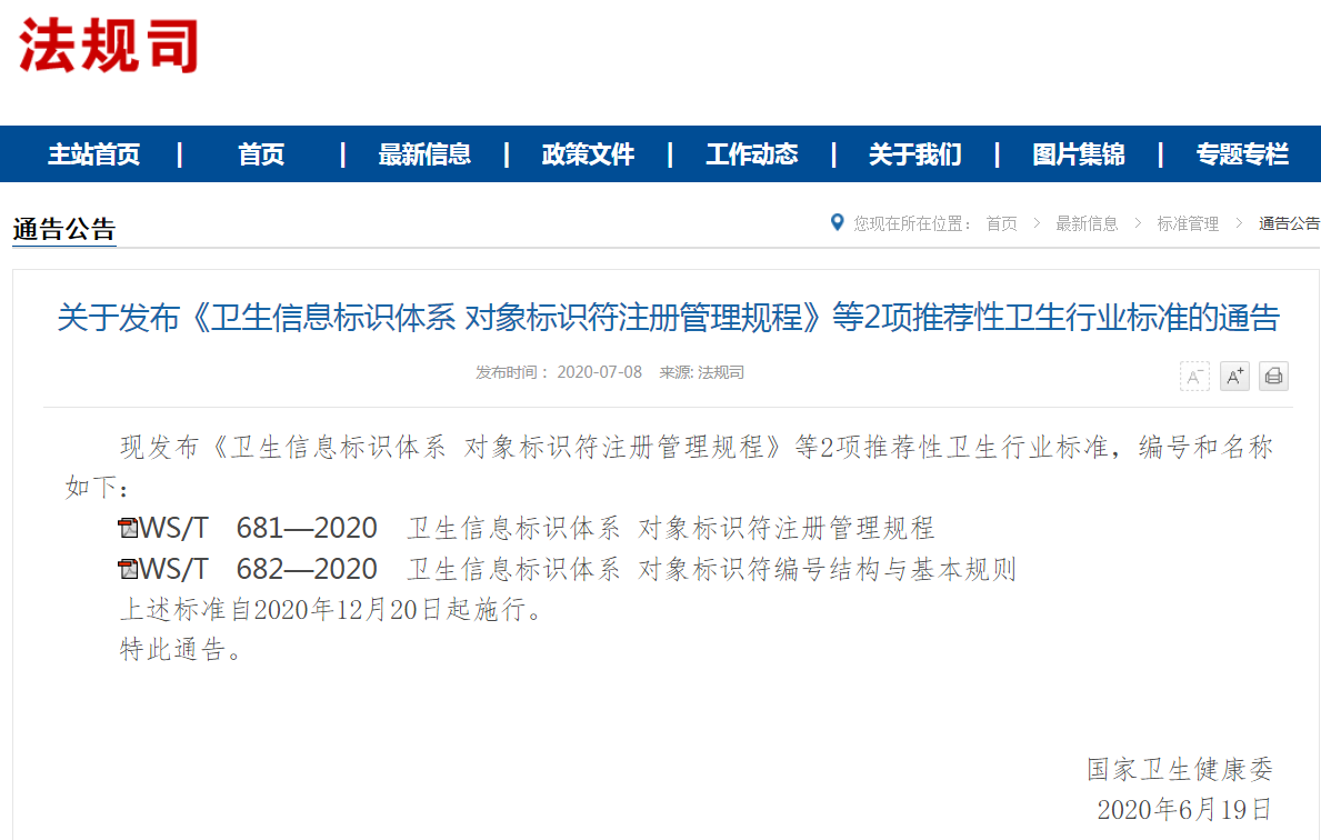 现发布《卫生信息标识体系对象标识符注册管理规程》等2项推荐性卫生行业标准,编号和名称如下: