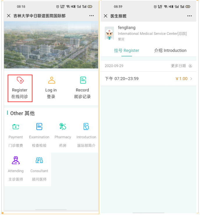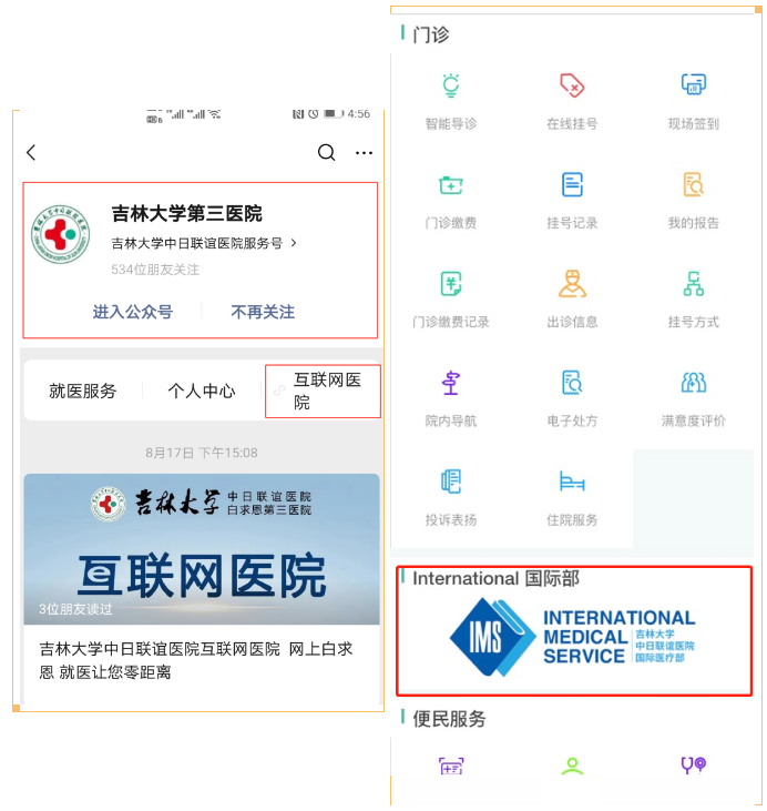 1.关注吉林大学第三医院公众号,点击就医服务进入INTERNATIONAL MEDICAL SERVICE吉林大学中日联谊医院国际医疗部。