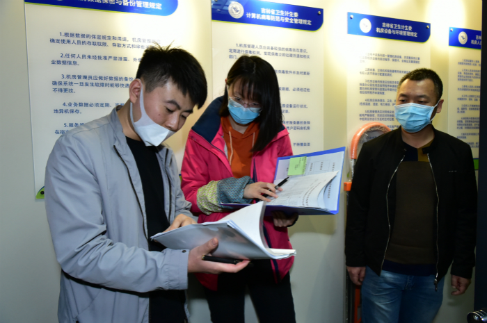 2020年5月3日,省卫生健康委16楼机房3个信息系统65台设备成功迁移至省全民健康数据中心。图为电子政务科工程师王佳正与长春嘉诚公司技术工程师核对迁移设备清单。