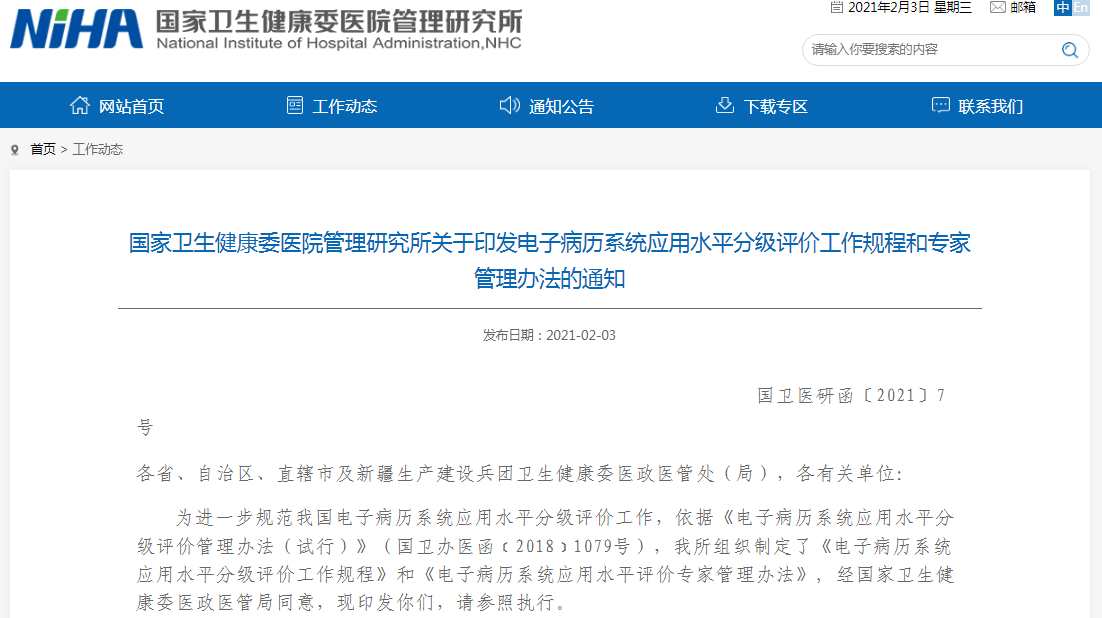 为进一步规范我国电子病历系统应用水平分级评价工作,依据《电子病历系统应用水平分级评价管理办法(试行)》(国卫办医函﹝2018﹞1079号),我所组织制定了《电子病历系统应用水平分级评价工作规程》和《电子病历系统应用水平评价专家管理办法》, 经国家卫生健康委医政医管局同意,现印发你们,请参照执行。