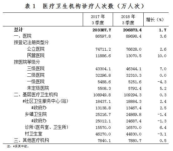 医院中:公立医院7.7亿人次,同比提高2.6%;民营医院1.3亿人次,同比提高10.0%。基层医疗卫生机构中:社区卫生服务中心(站)1.9亿人次,同比提高2.4%;乡镇卫生院2.5亿人次,同比下降1.4%;村卫生室诊疗人次4.5亿人次(见表1)。