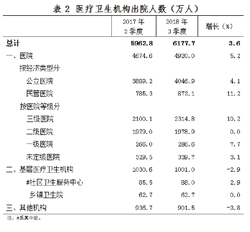 2018年第3季度全国医疗卫生机构出院人数达6177.7万人,同比提高3.6%。其中:医院4920.0万人,同比提高5.2%;基层医疗卫生机构1001.0万人,同比下降2.9%;其他机构256.7万人。