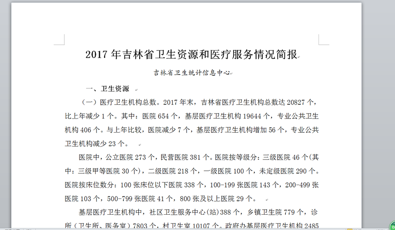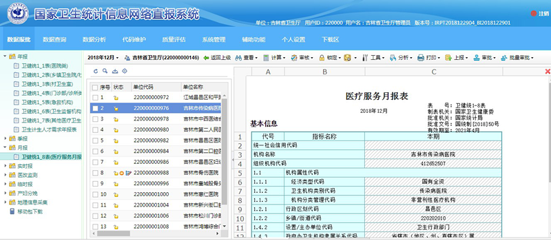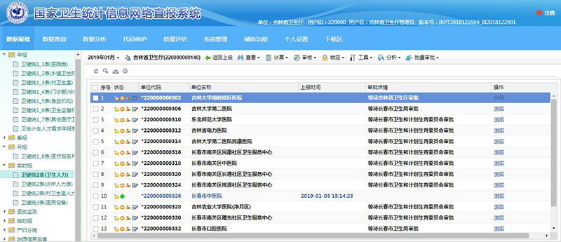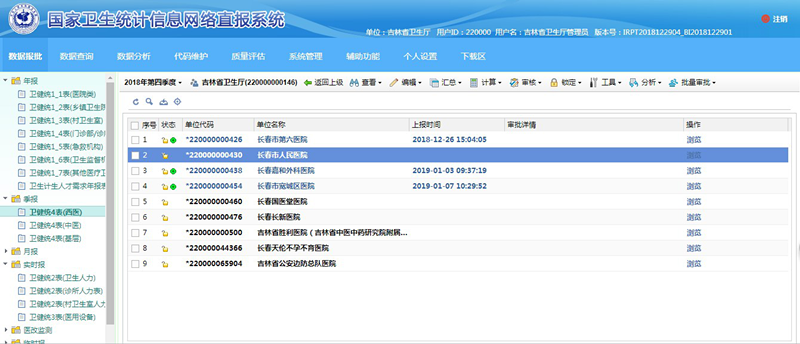 一是开展数据统计分析工作。完成2017年吉林省卫生计生统计年报数据填报、审核、修正、上报等工作。完成2018年季报、月报、实时报数据的催报、指导、审核、上报等工作。编写出版了2017年全省卫生资源和医疗服务情况简报,2017年吉林省卫生和计划生育事业发展统计公报,2018年1-11月全省卫生资源与医疗服务月报分析报告,《2017年度吉林省卫生计生统计资料摘要》和《2018年度吉林省卫生和计划生育统计年鉴》,完成31家三级医院基于DRGs系统绩效分析报告。