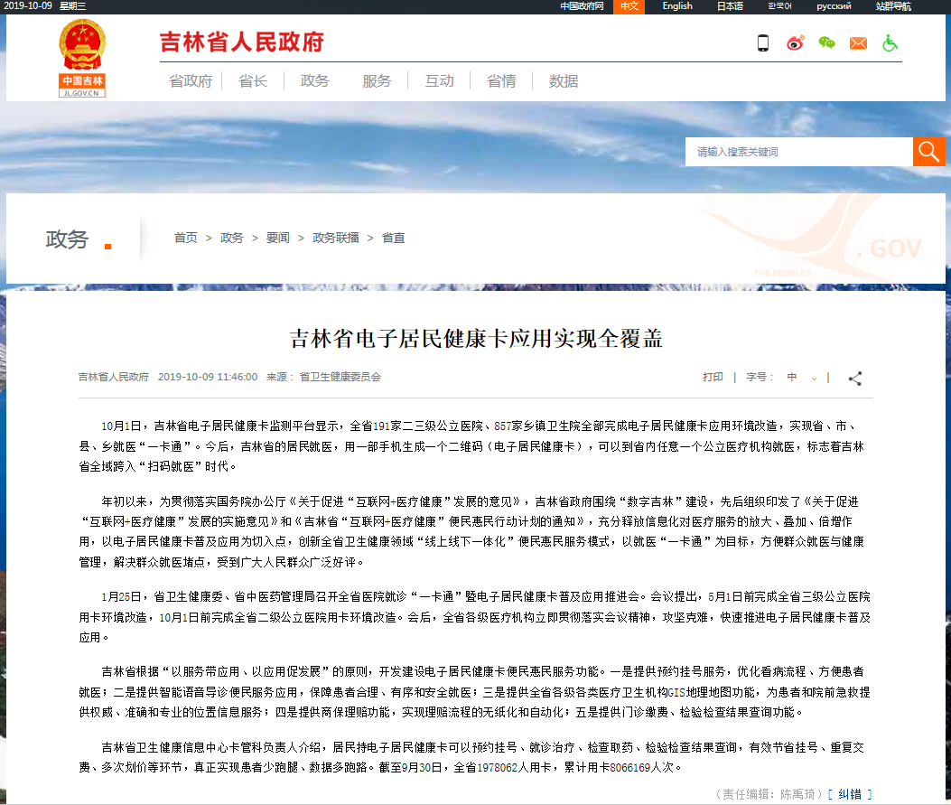 吉林省人民政府网:吉林省电子居民健康卡应用实现全覆盖