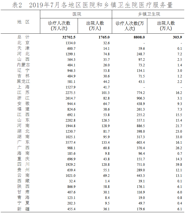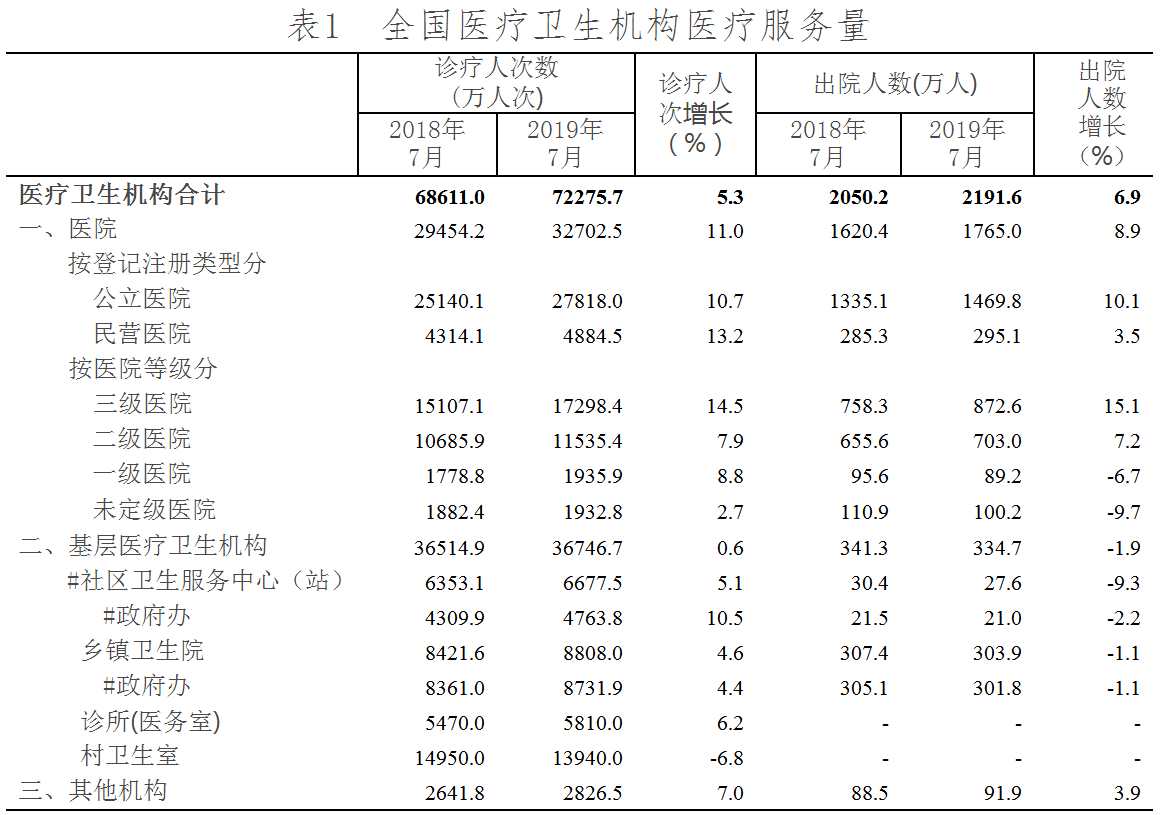 2019年7月份,全国医疗卫生机构诊疗人次7.2亿人次,同比提高5.3%,环比提高2.8%。