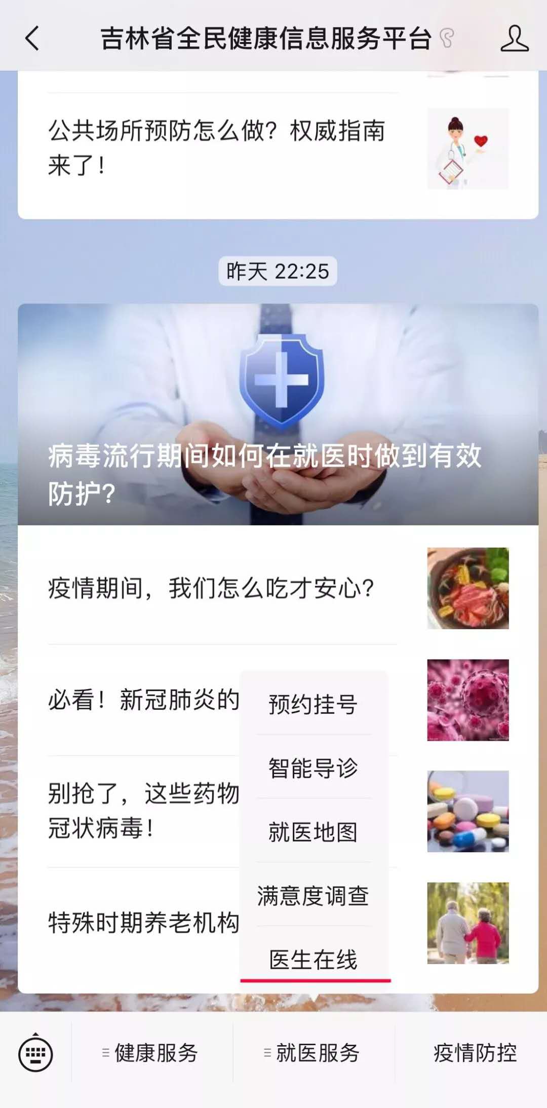 疫情防控期间,省全民健康信息服务平台推出的九个便民服务功能模块受到群众广泛欢迎。这九个功能包括:“吉林省疫情实时动态”“吉林省定点(发热)门诊导航”“发热症状自查”“主动申报与疫情线索提供”“新型肺炎小区速查”“医生在线”“疫情辟谣”“新型冠状病毒感染的肺炎科普”“全国疫情实时动态”等。