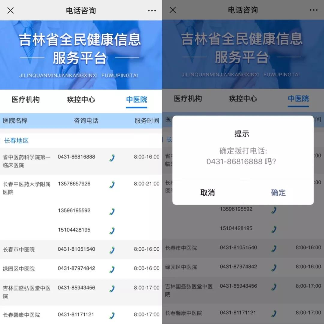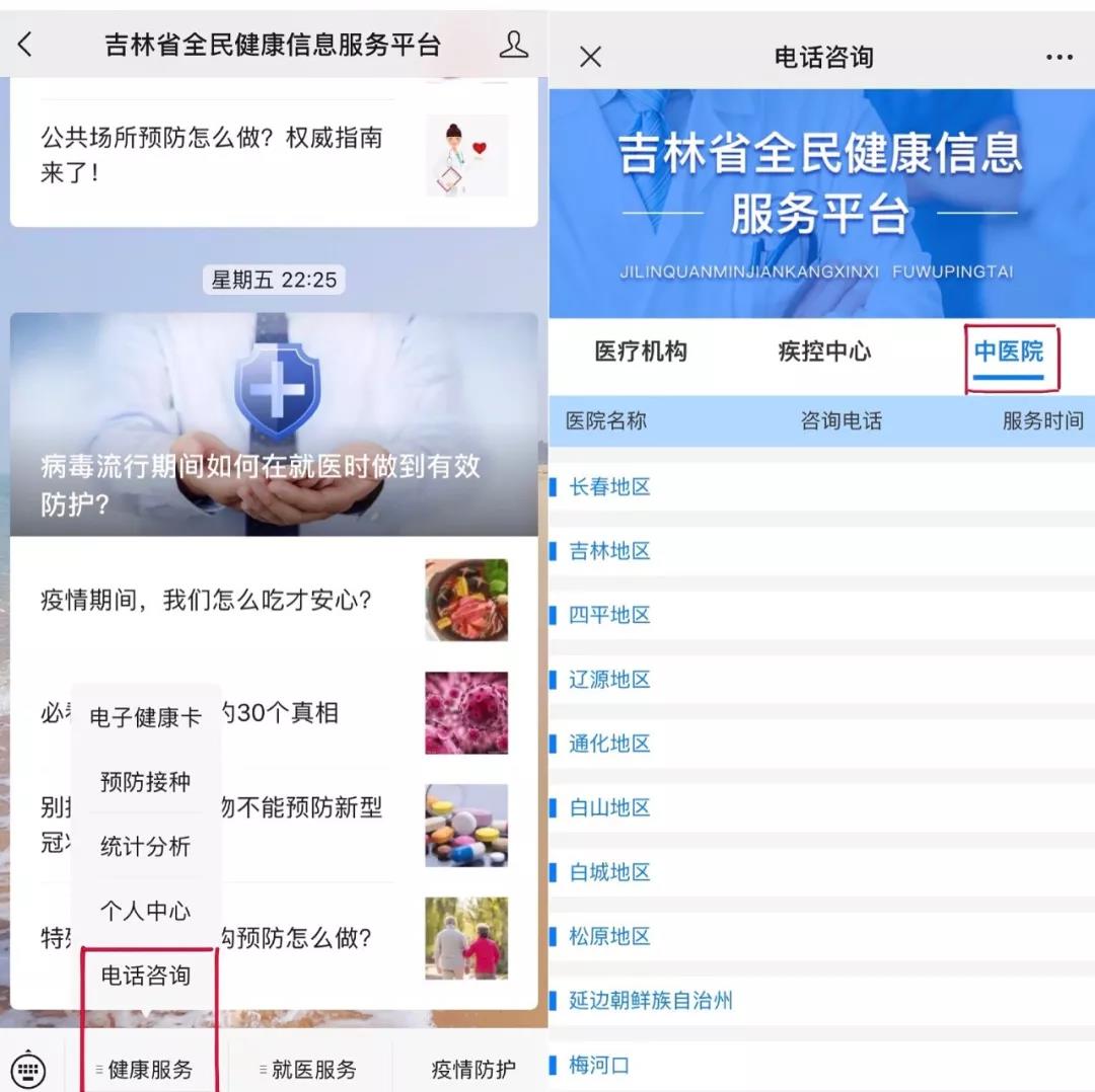 您只需长按下面的二维码,关注“吉林省全民健康信息服务平台”,在“健康服务”中点开“电话咨询”,全省84家中医院108部电话免费为群众提供咨询服务。