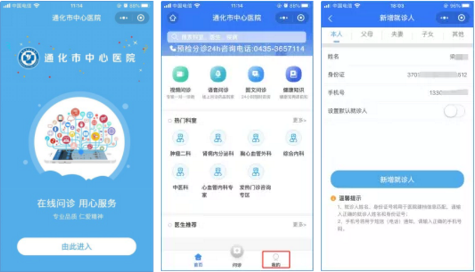 用户点击底部【我的】→【就诊人】→【添加就诊人】,完善就诊人信息,包括姓名、身份证、手机号等。