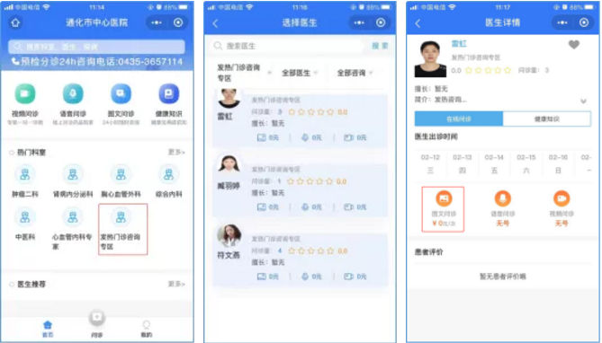 用户点击底部菜单【首页】→【发热门诊咨询专区】,按照提示选择要咨询的科室及医生,点击图文问诊即可在线问诊。