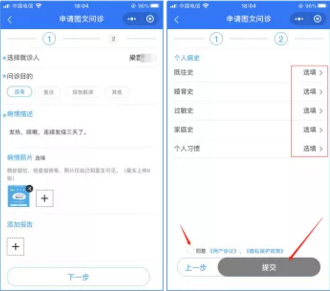 患者在病情描述界面选择就诊人,然后填写咨询目的和症状描述(至少输入10个字), 可通过添加图片功能上传检查、检验报告单,最后点击下一步,选填既往史、婚育史、过敏史、家庭史、个人习惯等信息最后点击提交。