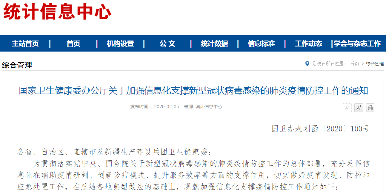为贯彻落实党中央、国务院关于新型冠状病毒感染的肺炎疫情防控工作的总体部署,充分发挥信息化在辅助疫情研判、创新诊疗模式、提升服务效率等方面的支撑作用,切实做好疫情发现、防控和应急处置工作,在总结各地典型做法的基础上,现就加强信息化支撑疫情防控工作通知如下: