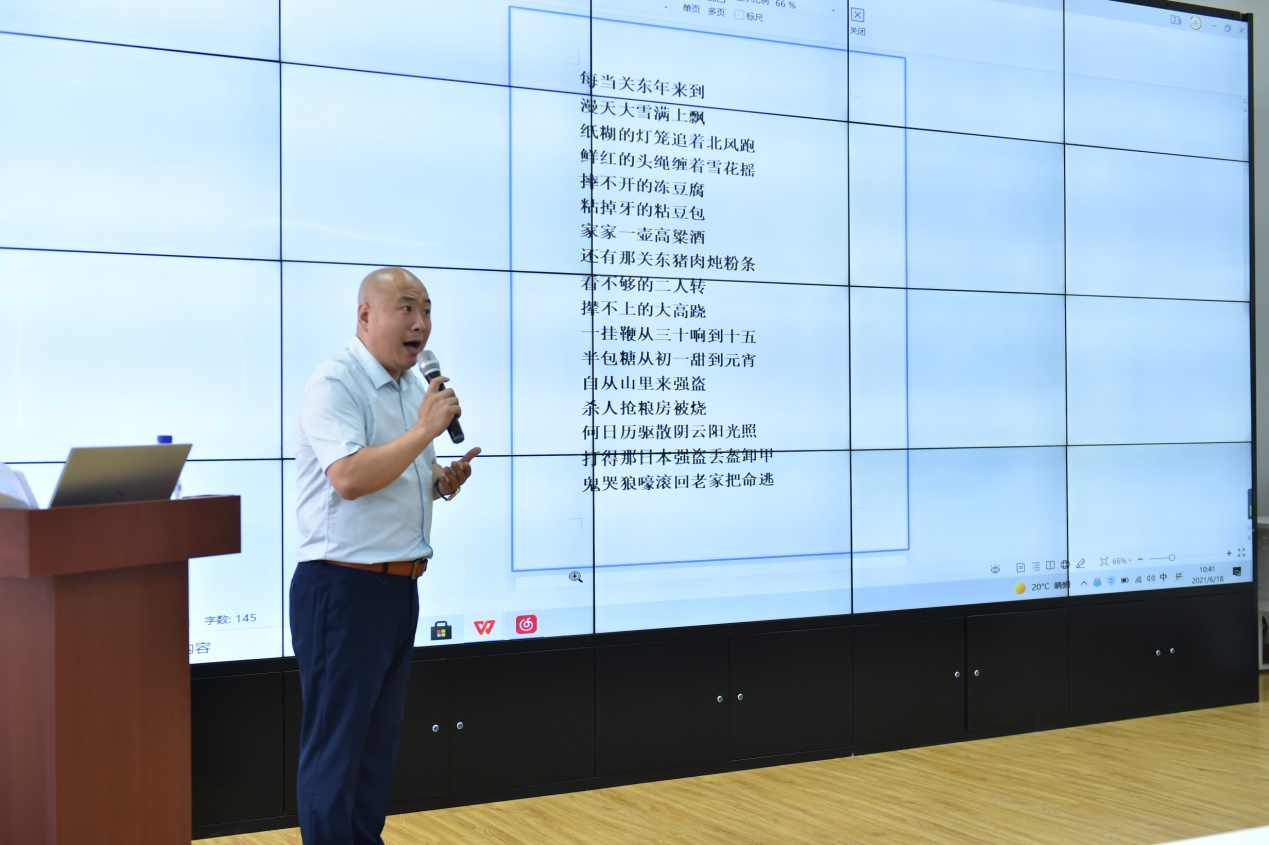 刘治强和大家分享了吉林省戏曲剧院京剧团创排的新编现代京剧《杨靖宇》,通过京剧的艺术手法和表现力,用独特的视角、大写意的手法描绘出了伟大的杨靖宇将军,和像他一样的无数先烈们不怕牺牲,视死如归,为了新中国与日寇战斗到最后一口气、流尽最后一滴血的东北抗联精神。第五场戏展现的是刘治强饰演的棒槌老人舍命送粮,饿死山中的感人故事。讲到兴致之时,刘治强满含深情的诵读了这一幕,精彩的对白、触动人心的台词再现了人民群众对杨靖宇将军的深厚感情、东北抗联军民鱼水一家亲的深厚情谊。随后,刘老师唱起了剧中棒槌老人唱过的歌曲《过年》,情绪饱满,唱腔动听,台下的同志们听得认真入神,深受鼓舞,现场掌声不断。