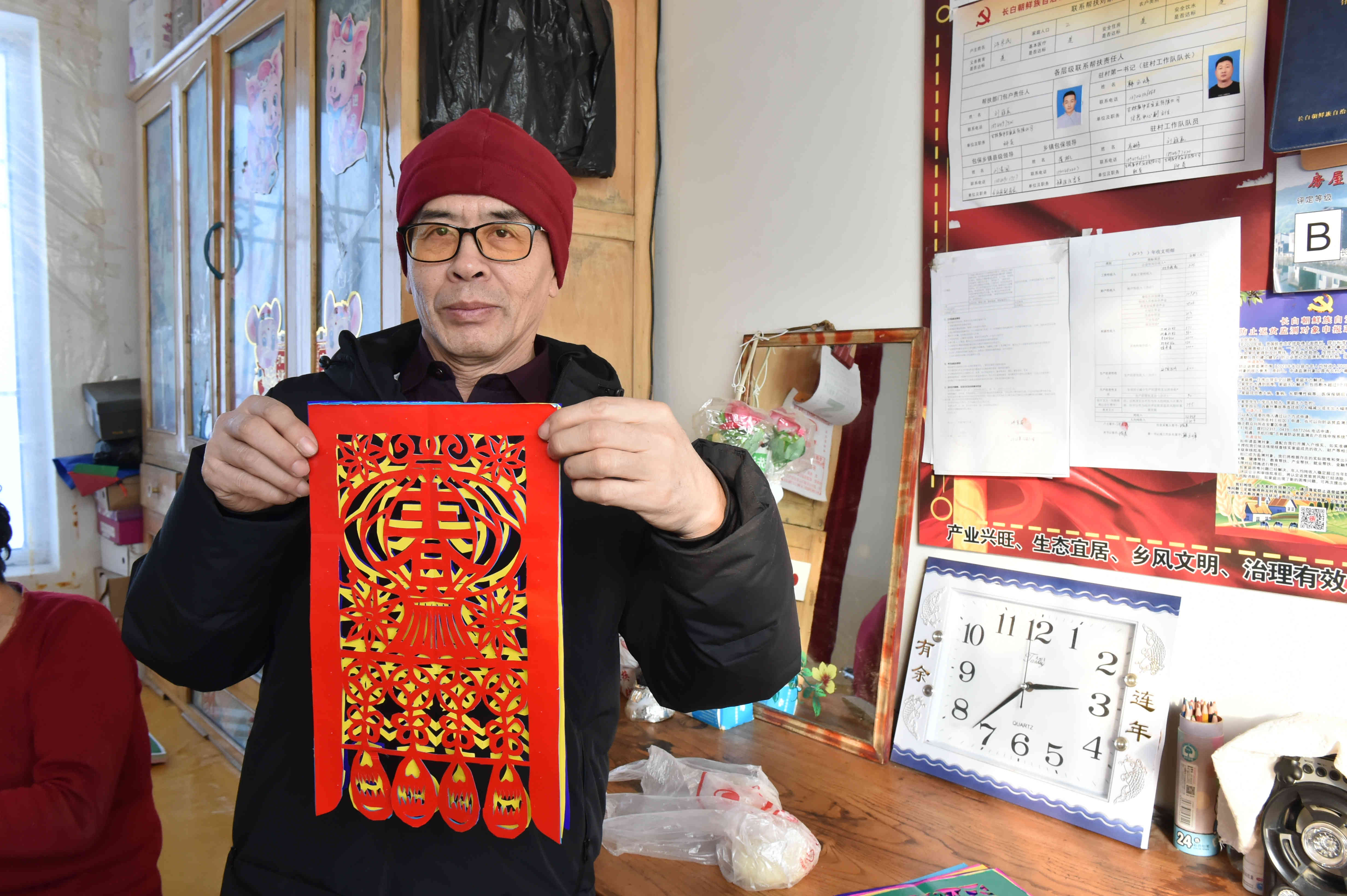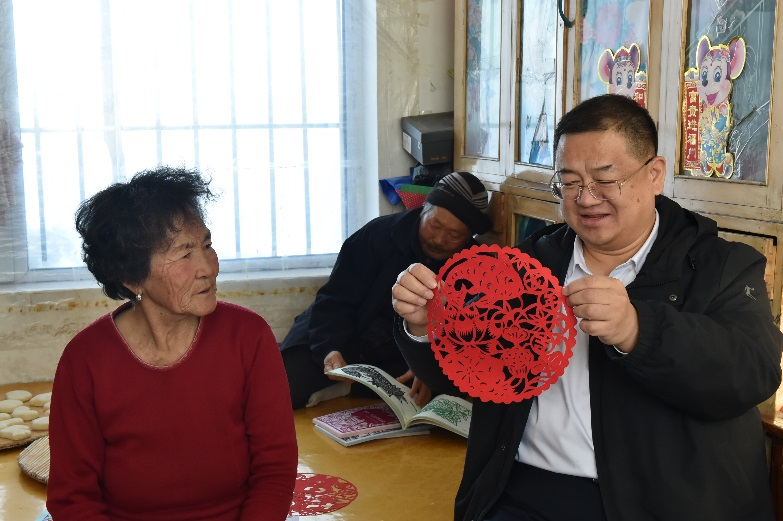 去年底,信息中心在走访脱贫户时发现,75岁的滕兆琴有文化、心灵手巧,自己绘制图样做剪纸、编花篮。但是苦于没有得心应手的剪纸工具和设计指导书籍,没法儿发挥出来真正的手艺。张启军发出朋友圈后,悠游(吉林省)数字传媒总经理李绍春马上联系到滕兆琴,将其剪纸作品作为公司代理的直播带货产品的宣传图案。他们这次来栾家店村就是专程为滕兆琴老人颁发公司民间艺人聘书和2000元稿费,李绍春还带来了3本剪纸艺术设计图书和年货。
