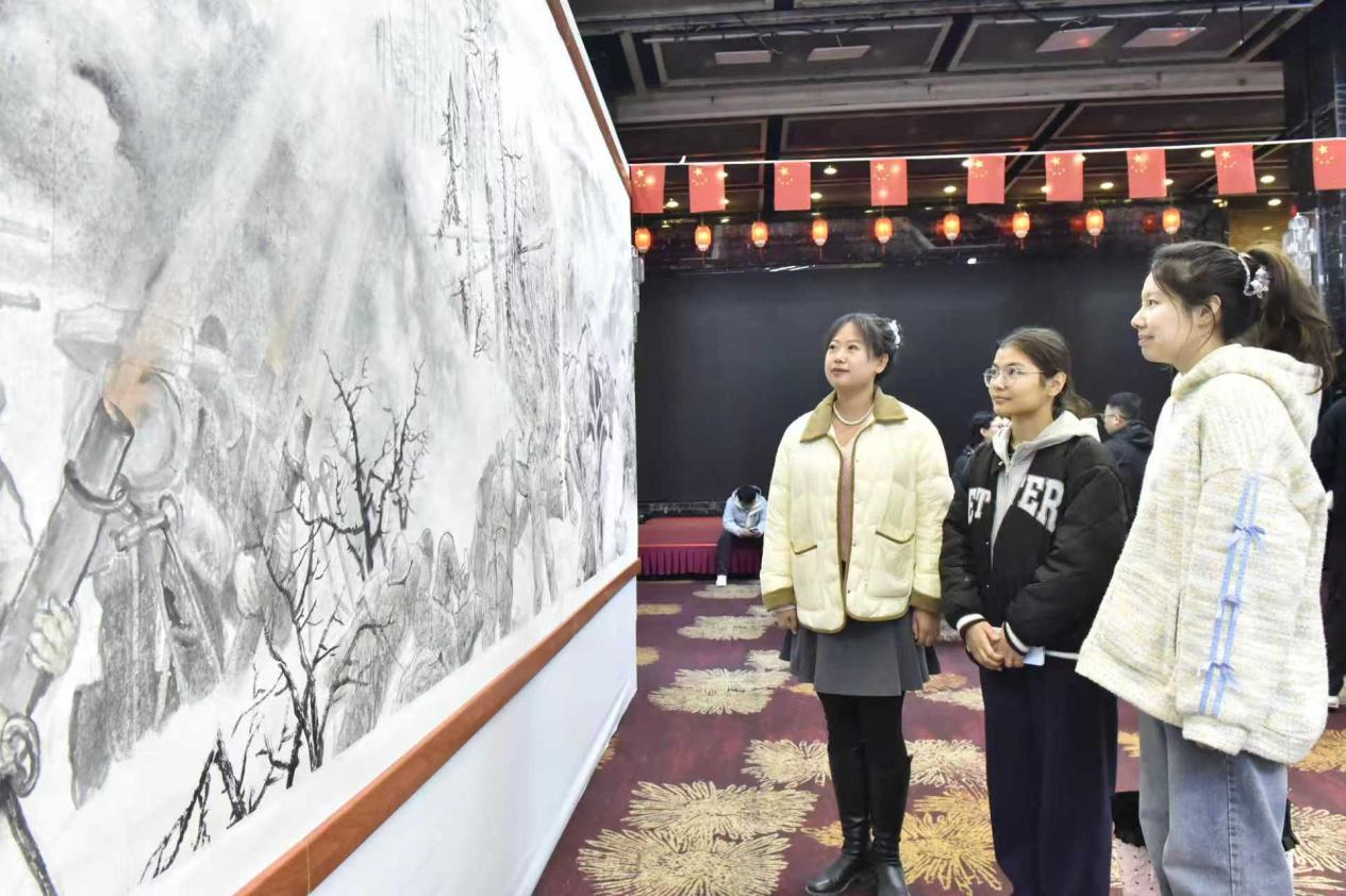 讲解员老师深情讲述了杨靖宇将军的英雄事迹,真挚的情感与动人的故事令在场观展者深受触动、备受鼓舞,大家仿佛真正“步入”画卷,感受到那个冰与火铸就的岁月,东北抗联战士们用血肉之躯对抗严寒,用燃烧的意志照亮黑暗。这是一堂深刻的爱国主义教育课,它将厚重的历史转化为生动的艺术语言,使英雄的精神通过艺术的载体得以传承。