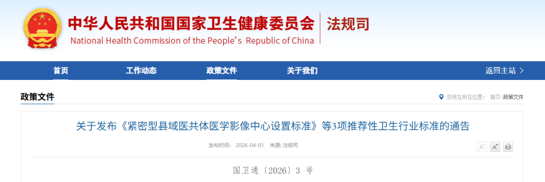 现发布《紧密型县域医共体医学影像中心设置标准》等3项推荐性卫生行业标准,编号和名称如下:
