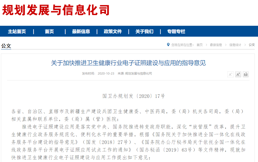 到2020年12月,完成国家级电子证照系统建设、部署,完成与国家政务服务平台的对接改造。制定卫生健康行业电子证照统一标准。