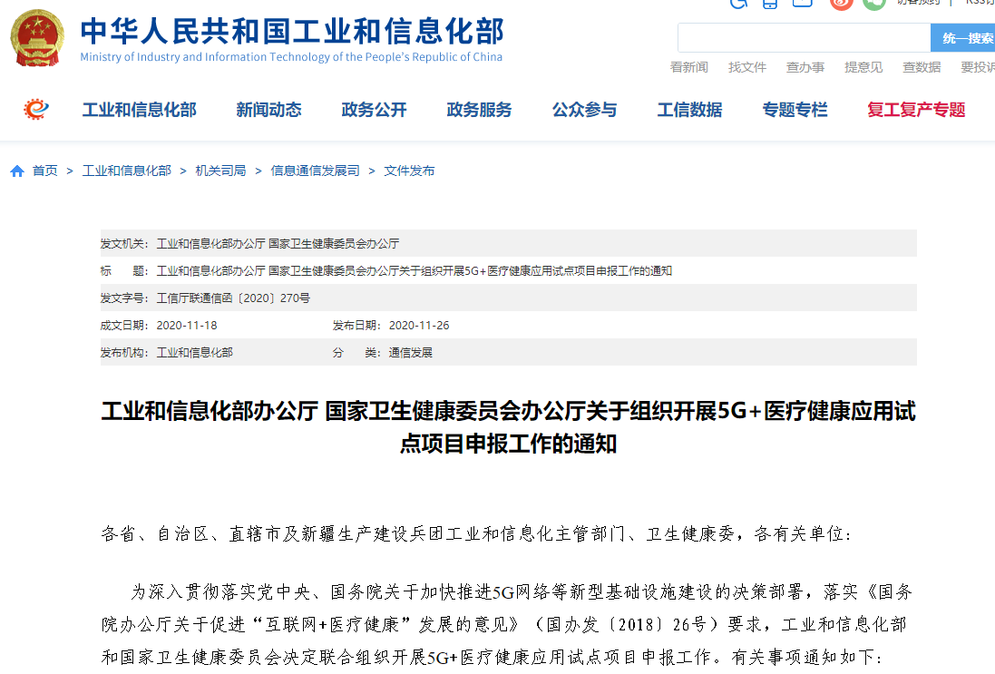 为深入贯彻落实党中央、国务院关于加快推进5G网络等新型基础设施建设的决策部署,落实《国务院办公厅关于促进“互联网+医疗健康”发展的意见》(国办发〔2018〕26号)要求,工业和信息化部和国家卫生健康委员会决定联合组织开展5G+医疗健康应用试点项目申报工作。有关事项通知如下:
