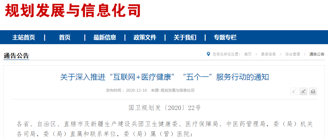 《国务院办公厅关于促进“互联网+医疗健康”发展的意见》(国办发〔2018〕26号)等文件印发以来,各地迅速行动、创新落实,推动“互联网+医疗健康”发展取得了明显成效,形成了部门协同、上下联动的良好态势。特别是在疫情防控期间,各地创新线上服务模式,为支撑疫情精准防控、避免聚集交叉感染、促进人员有序流动和复工复产等发挥了重要作用。为总结推广实践中涌现出的典型做法,进一步聚焦人民群众看病就医的“急难愁盼”问题,持续推动“互联网+医疗健康”便民惠民服务向纵深发展,国家卫生健康委、国家医保局、国家中医药局决定在全行业深化“五个一”服务行动。现将有关事项通知如下: