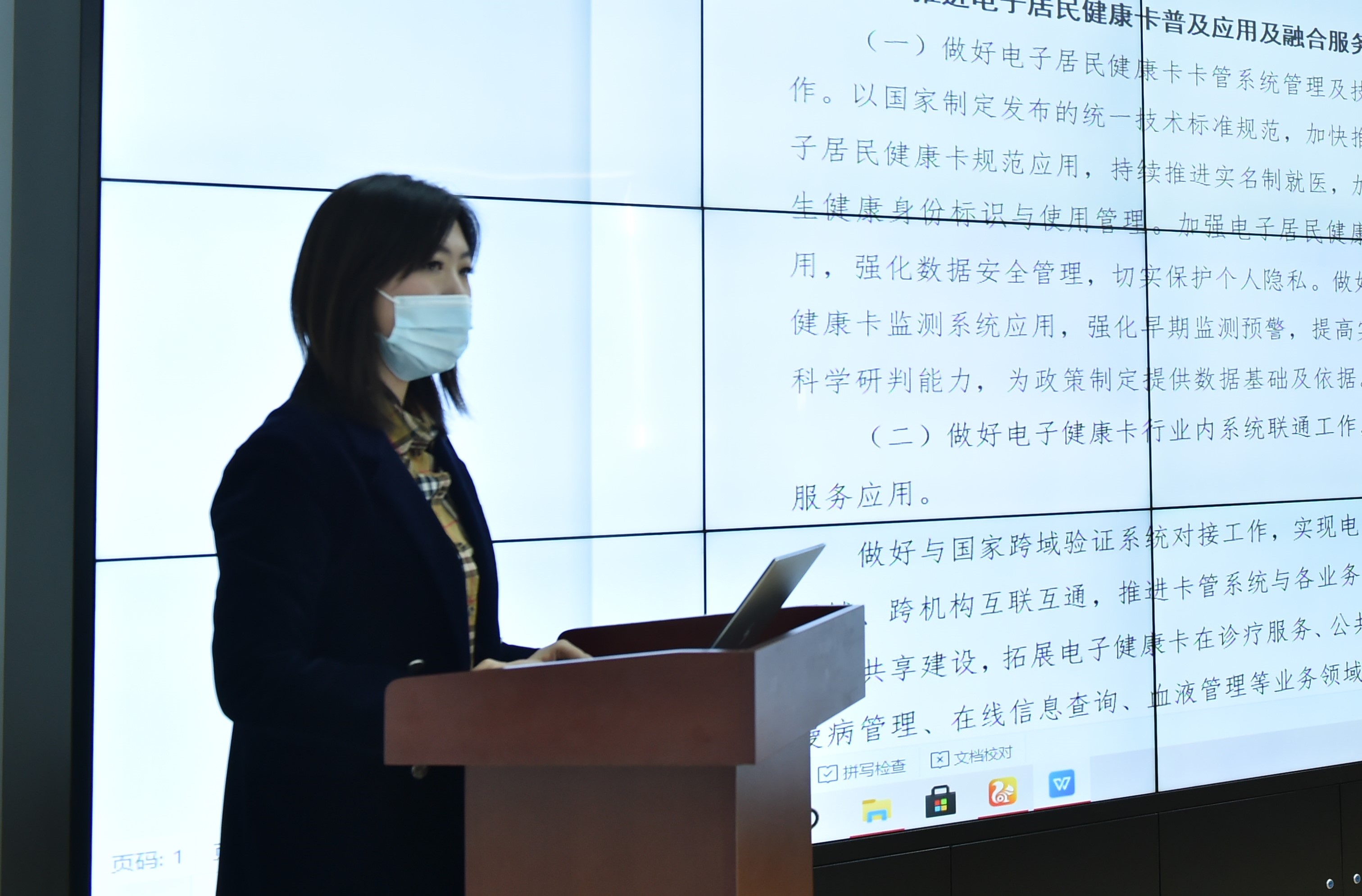 信息技术科科长任丽利结合会议精神,从推进电子居民健康卡普及应用及融合服务、做好全省互联网医院信息技术指导及省互联网医疗服务监管平台功能完善、强化疫情防控信息化支撑保障等方面汇报2021年工作思路。