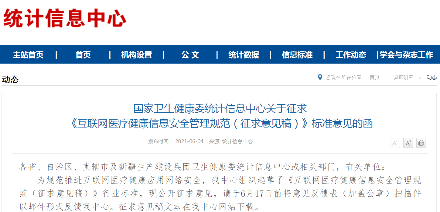 为规范推进互联网医疗健康应用网络安全,我中心组织起草了《互联网医疗健康信息安全管理规范(征求意见稿)》行业标准,现公开征求意见,请于6月17日前将意见反馈表(加盖公章)扫描件以邮件形式反馈我中心。征求意见稿文本在我中心网站下载。