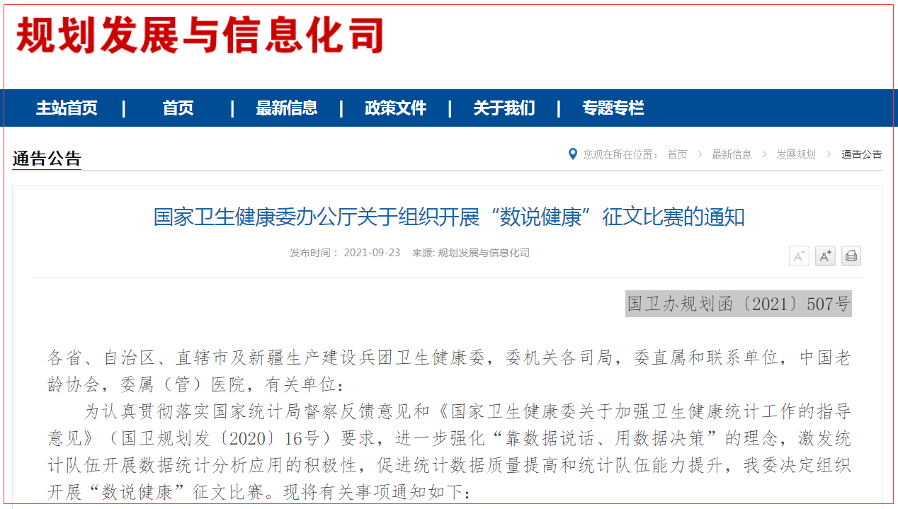 为认真贯彻落实国家统计局督察反馈意见和《国家卫生健康委关于加强卫生健康统计工作的指导意见》(国卫规划发〔2020〕16号)要求,进一步强化“靠数据说话、用数据决策”的理念,激发统计队伍开展数据统计分析应用的积极性,促进统计数据质量提高和统计队伍能力提升,我委决定组织开展“数说健康”征文比赛。现将有关事项通知如下: