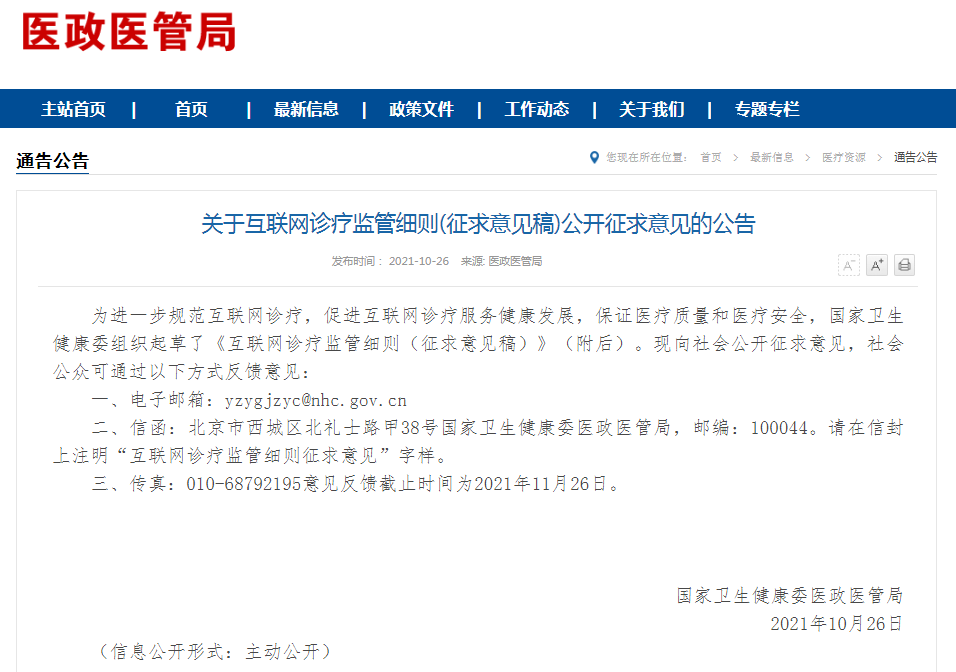 为进一步规范互联网诊疗,促进互联网诊疗服务健康发展,保证医疗质量和医疗安全,国家卫生健康委组织起草了《互联网诊疗监管细则(征求意见稿)》(附后)。现向社会公开征求意见,社会公众可通过以下方式反馈意见: