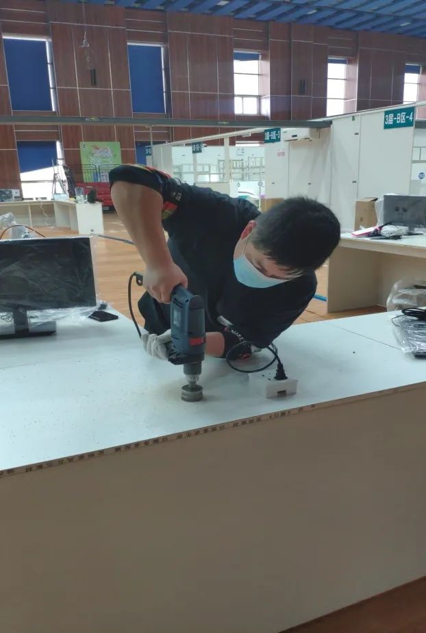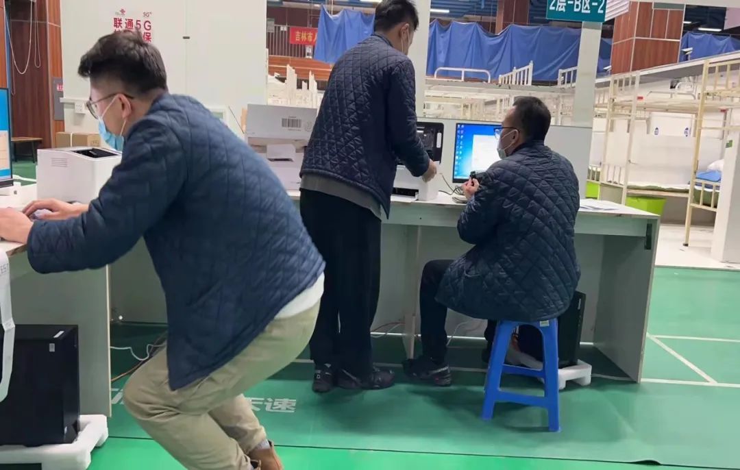 3月10日8时,信息科人员到达方舱医院后立刻投入到工作中,为三层6个病区安装18台电脑和9台打印设备。为了更快完成网络铺设,信息科还承担起了木工和焊工的工作,办公桌打孔、锯线槽……都有模有样。疫情防控期间,吉林市人民医院信息科共承建了三所方舱医院的信息建设工作,速度和成果均得到了高度肯定。
