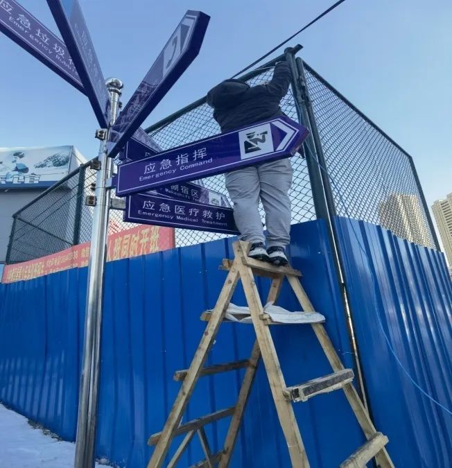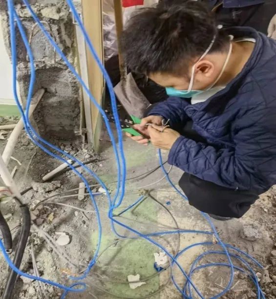 3月20日,信息科张朕源和马瑞鸿同志不惧风险,登高为第二方舱医院的移动CT机铺设网络。