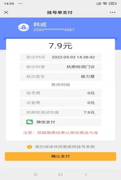 5月1日,按医院要求在公众号中实现预约并缴费抗原检测试剂盒的功能,信息科联合奥丁科技和东软公司,用了两天时间于5月3日圆满完成。