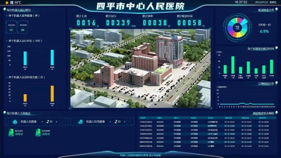 此外,借助机器人全院物流精细化管理“驾驶舱”,构建丰富全面的耗材流转监控数据,通过在线实时采集机器人状态数据,实现设备运行状态可视化、故障告警实时提示、物资运输状态跟踪、配送时间波动监测等丰富的数据报表呈现,实现机器人的高效运维,也为管理决策者提供科学依据。