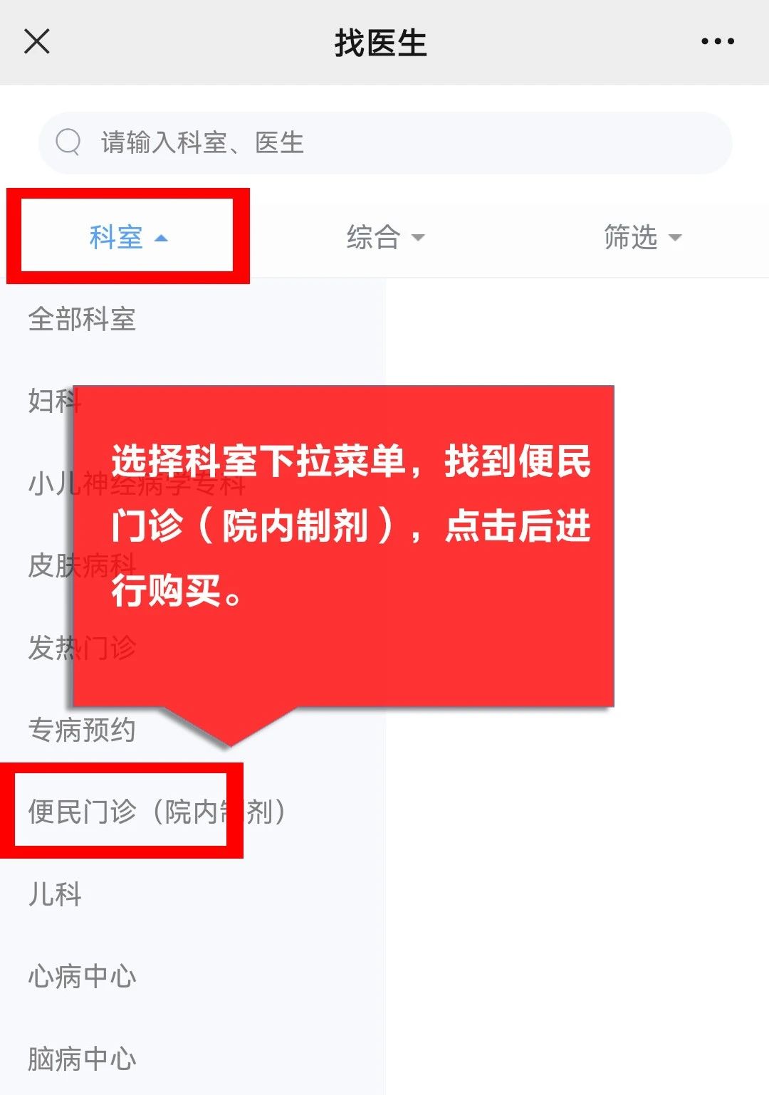 医院现已开设便民门诊,位于预检分诊入口处。您可以根据医院最新的就医须知,按防疫要求在便民门诊直接购买医院制剂药品。
