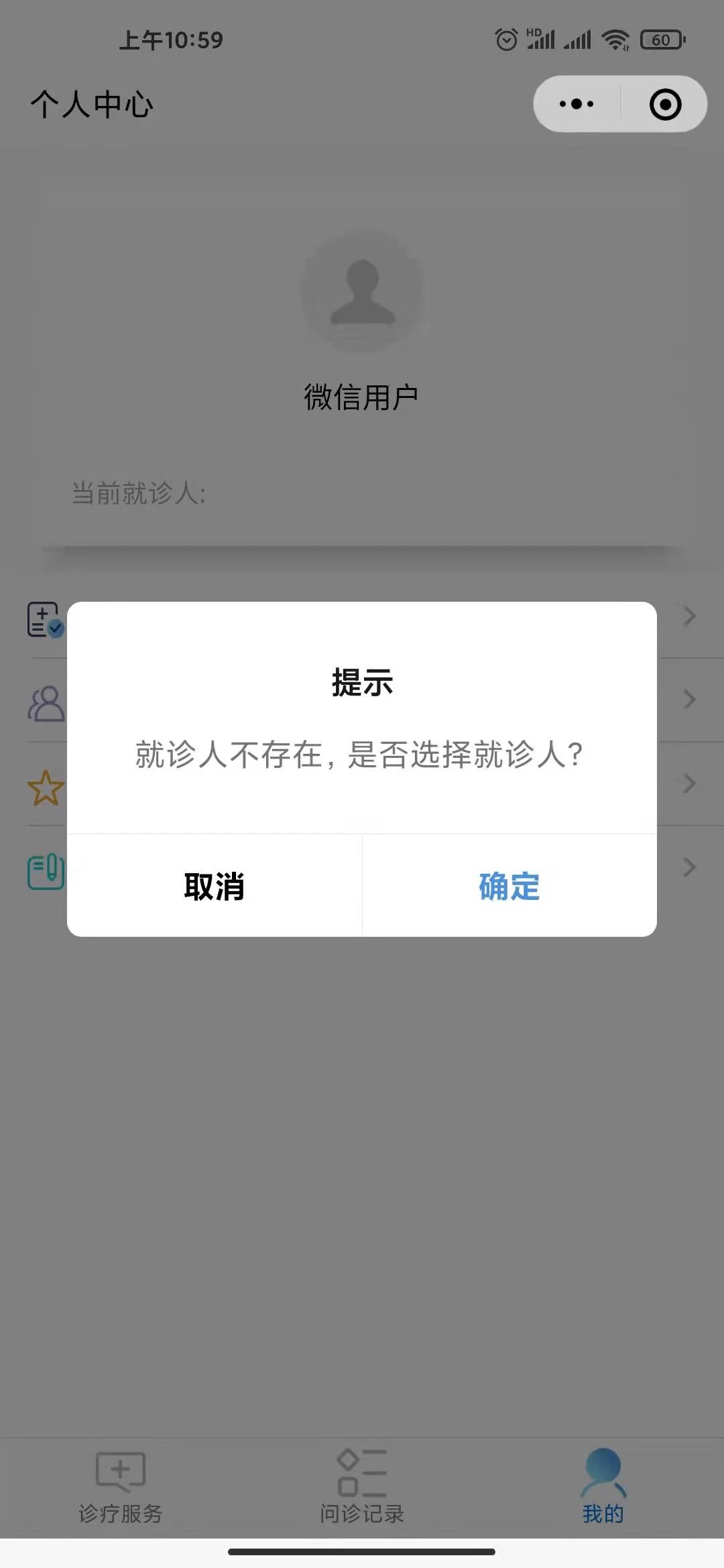 一步进行“就诊人”绑定,如果就诊人不存在,根据提示添加选择就诊人,点击“确定”按钮。