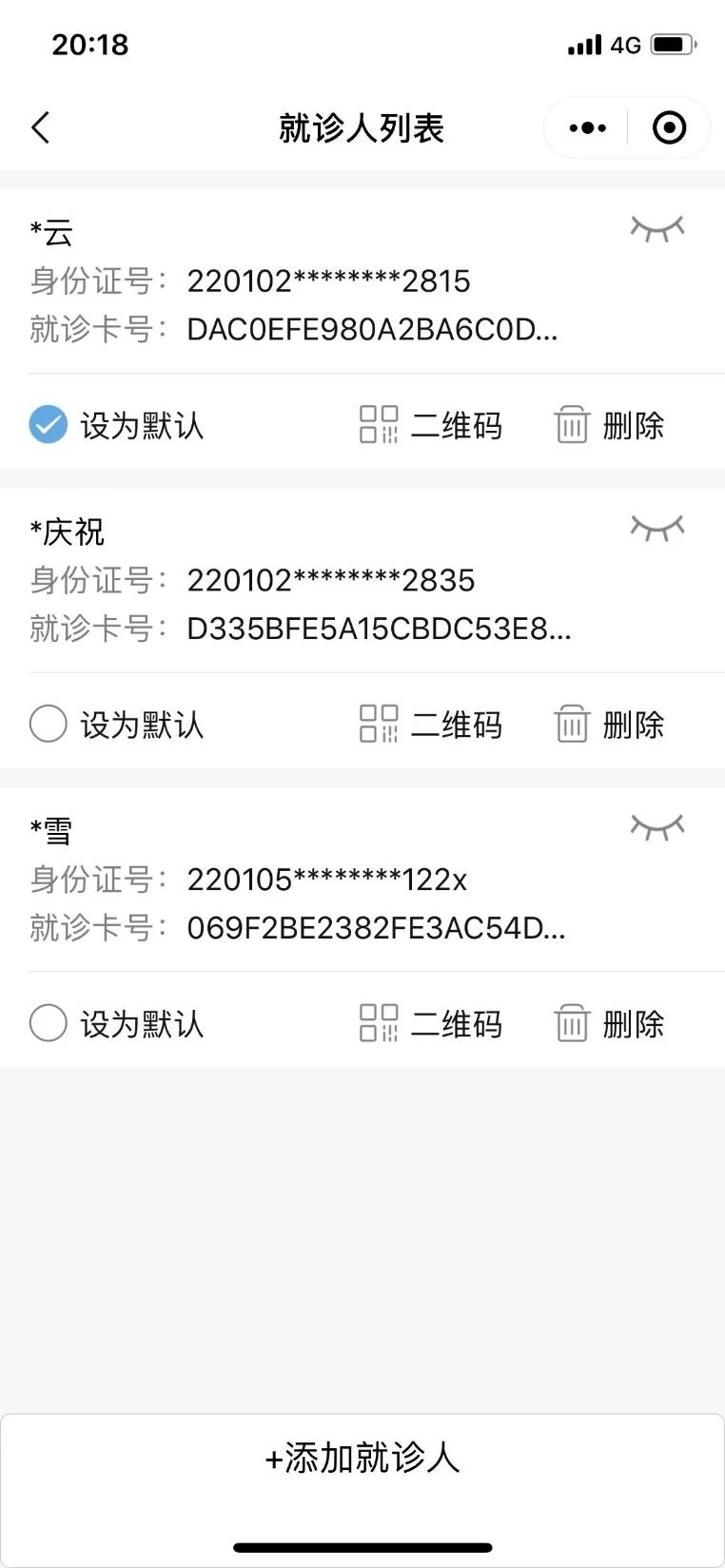 如果默认就诊人不是患者本人,可以点击屏幕最下方“+添加就诊人”,进行手动录入正确的就诊人信息。如果系统已经绑定多个就诊人,可以在就诊人列表进行选择确认,确认完毕后点击左上角“<”返回到问诊主界面。