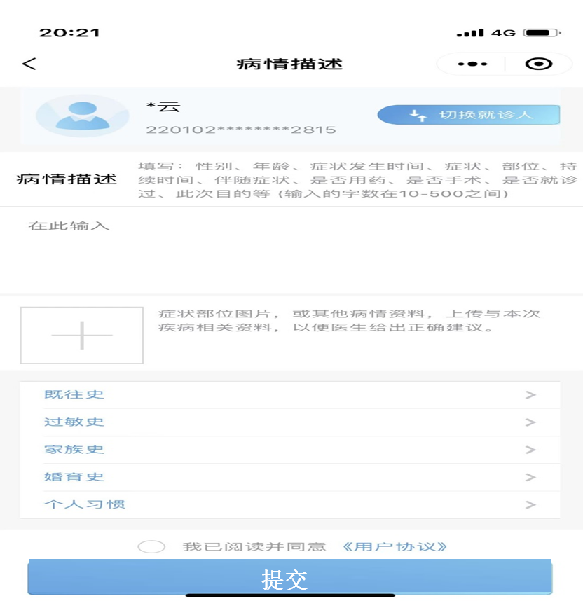 完成交费后进入与医生交互问诊环节,按照提示需要先完成自身病情描述、既往史、过敏史等说明,支持图片及文字描述,如果有检查检验报告支持上传,可以点击图中+号添加图片,可以直接现场拍摄,也可以点击相册上传。