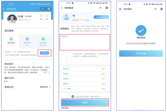 第二步:在医生主页中,点击【立即咨询】,录入病情基本情况,点击【挂号】,在线支付挂号费。