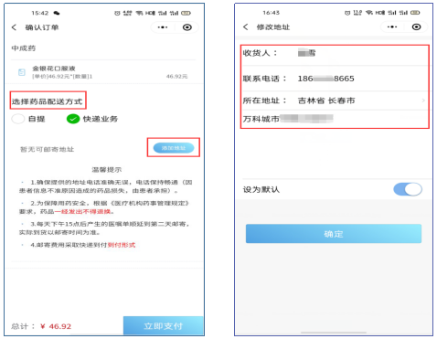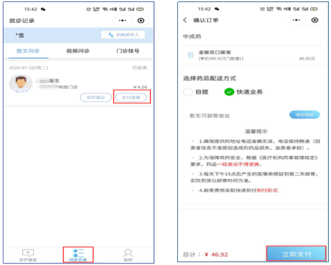 点击小程序【问诊记录—支付费用】,支付时选择药品配送方式,填写配送地址。