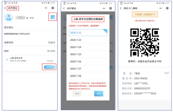 点击小程序【问诊记录—诊疗建议】,支付费用后,点击【预约时间】进行预约,患者在预约时间段可持就诊卡二维码直接到诊室进行检查。