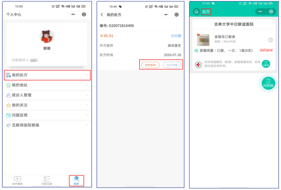 点击小程序【我的】,选择【我的处方】,查看处方详情及用药指导。