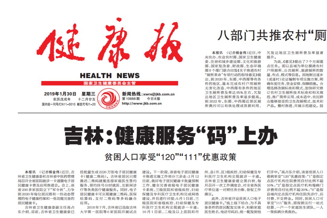 2019年1月30日,《健康报》在头版头条报道我省推进电子居民健康卡工作,刊发了题为《吉林:健康服务“码”上办》的新闻报道。