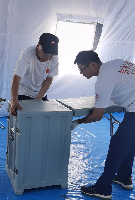 在急救药品运输演练科目中,信息保障组联络员闫帅现场通知桦甸市人民医院信息科李宗洋:栗子河上游突发洪水,榆木桥村公路桥梁冲毁,西岸122高地有一四十多岁女性危重伤员,现场医务人员告急请求止血药品支援,现无人机已在你院门诊楼前。桦甸市人民医院快速响应,4分钟后,操作员王帅、观察员卢明浩升空载药无人机,15分钟后药品到达急救地点。