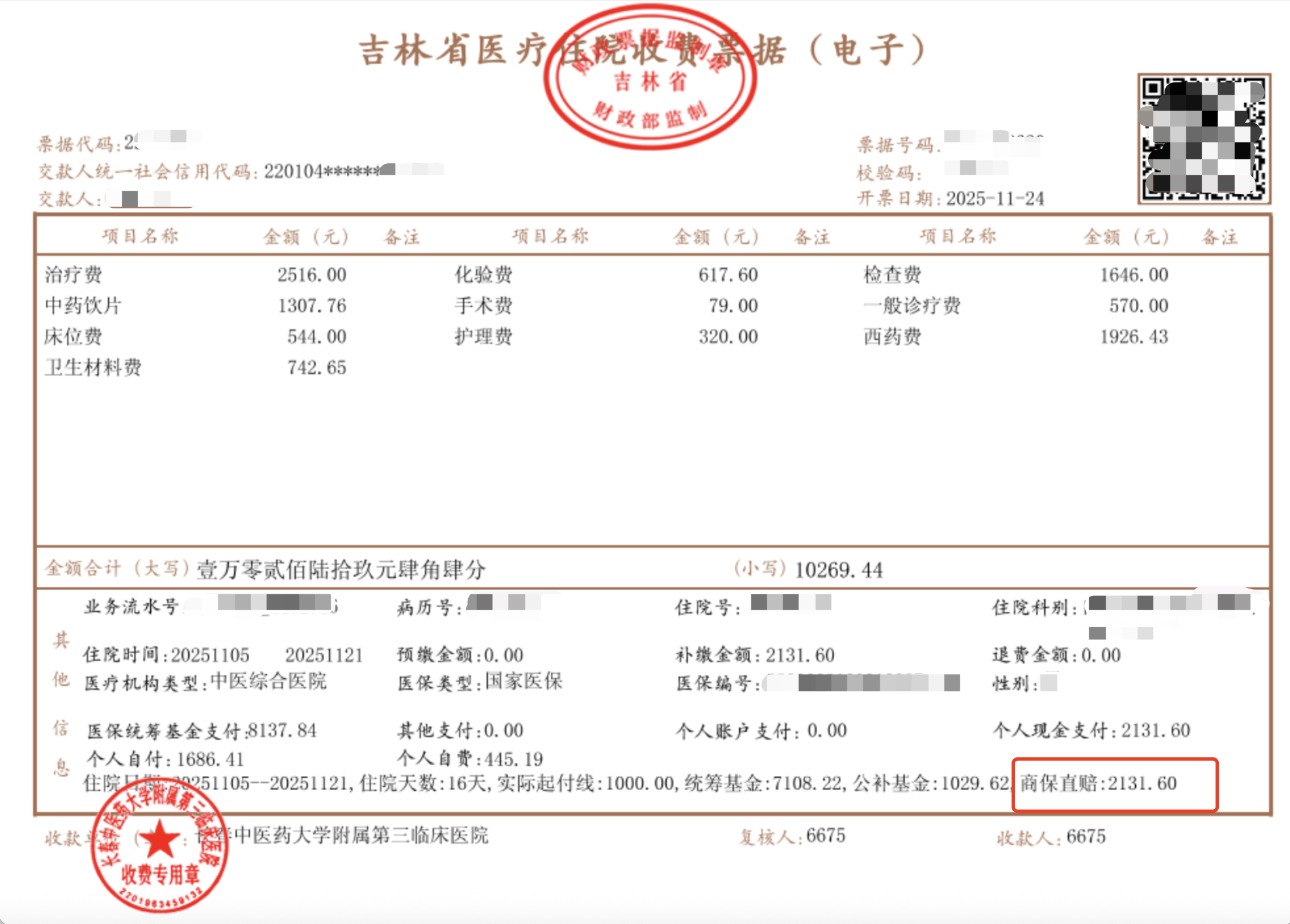 该院首例商保直赔结算成功的发票