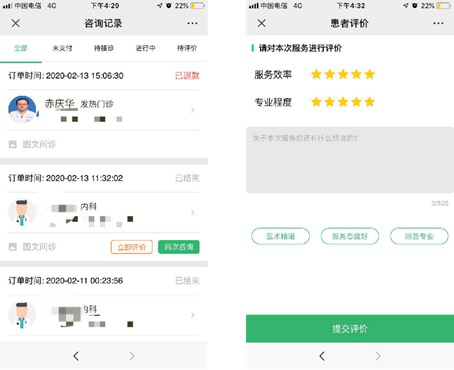 居民可依据个人情况,选择全省范围内的医生发起在线咨询。医生接诊后,医患之间可通过文字、图片及语音等方式实时交流。咨询结束后居民可对医生的服务进行点评。