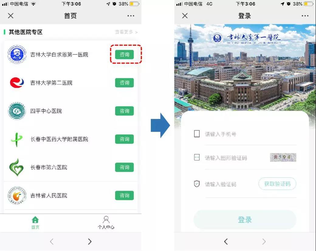 重点医院专区为独立开展在线问诊服务的医院专区列表,选择一个医院,点击【咨询】,可打开所选医院的互联网问诊服务平台,进行咨询问诊。